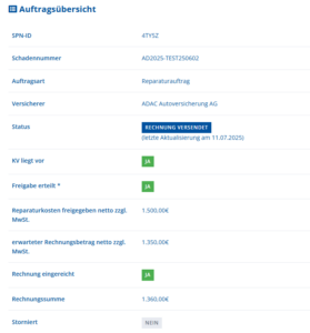 Angezeigt wird der zum Zeitpunkt des Aufrufs im SPN System hinterlegte Auftragsstatus und alle weiteren Informationen zu KV, Freigabe und Rechnung.